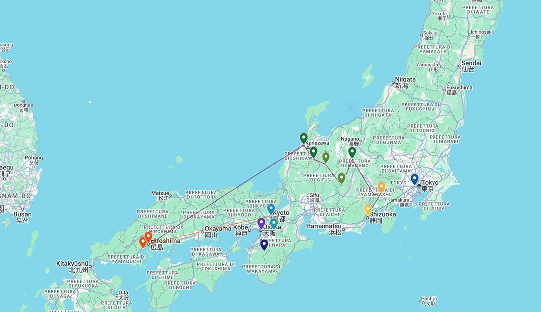- Trasferimenti e trasporti necessari per lo svolgimento del programma in pullman privato; treno veloce e treno shinkansen da Kanazawa a Hiroshima e da Hiroshima a Kyoto, con spedizione bagagli inclusa; imbarcazione per la crociera
